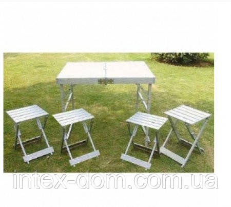 Стіл складаний алюмінієвий + стільці; в складеному стані являє собою компактний